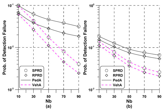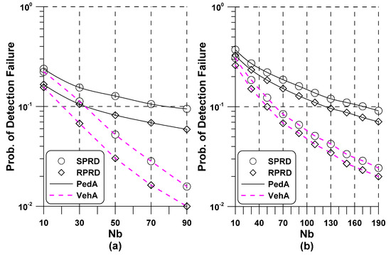 Figure 4 depicts the probability of detection failure of the RFN detector and the probability of detection failure of the PCID detector in the PedA channel. We considered the scenario where both STO and CFO were detected in the time domain adopting the method in Equations (7) and (9), wherein initial STO and CFO estimation was based on -times average autocorrelation metric of the NPSS. After initial STO and CFO compensation, the received signal was transformed to the frequency domain, leading to residual errors and at the post-FFT stage. When compared to the RPRD method, the performance of the SPRD method came to approach that of ideal initial synchronization as increased, equivalently, initial STO and CFO estimation became more accurate. Another interesting remark is that was greater than due to the larger number of hypotheses associated with detecting the PCID. Based on such observation, it was expected that the overall probability was primarily determined by .