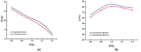 Comparison of external characteristics curves in the submersible pump. (a)Head characteristic curve; (b) Efficiency characteristic curve.