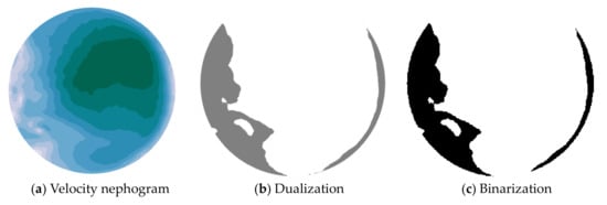 Figure 4 shows the process of identifying the area of the easy deposition region. Based on three times the settling velocity, the velocity nephogram was dualized, and the binary velocity nephogram was binarized by threshold segmentation. The area calculation was performed based on MATLAB GUI and image processing functions. Finally, the actual area of the easy deposition region Ad and the pump pit surface area Aa were obtained, the formula for calculating the area ratio of the easy deposition region is as follows: