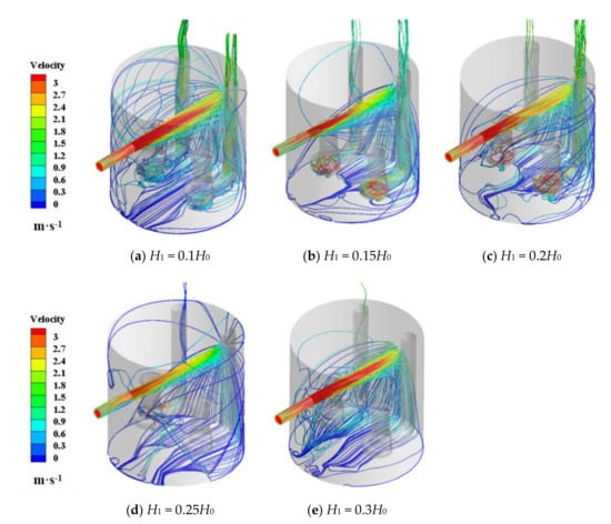 Figure 6 shows the movement of particles at different suspension heights. It can be seen that when the particles hit the wall, they spread uniformly to the bottom of the pump pit, the velocities of the particles near the center are larger, and the velocities of the particles far away from the center of two submersible pumps decrease gradually, and then move toward the side of the inlet pipe. Due to the influence of the suction of the submersible pump, the particles diverging to both sides tend to converge at the center of two submersible pumps, which is very obvious in 0.1H0. The number of particles sucked into the two submersible pumps is basically the same at a low suspension height, whereas with an increase in the suspension height, the number of particles escaping from the pipeline is significantly different and the total number of particles passing through also decreases.