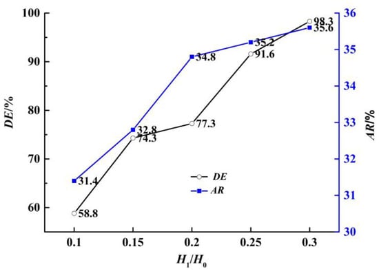 Figure 8 indicates the area ratio and deposition rate of the easy deposition region. When the suspension height is 0.1H0, the area ratio of the easy deposition region is 31.4%, and the deposition rate is 58.8%. When the suspension height is 0.2H0, the area ratio and deposition rate of the easy deposition region are 34.8% and 77.3%, respectively. When the suspension height is 0.3H0, the area ratio and deposition rate of the easy deposition region increase to 35.6% and 98.3%, respectively. It was found that the area ratio and deposition rate of the easy deposition region show an upward trend with an increase in the suspension height.