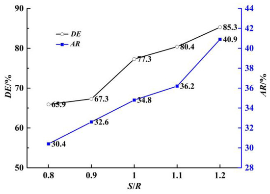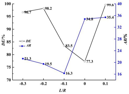 Figure 13 shows the easy deposition region under different center distances. Figure 14 shows the area ratio and deposition rate of the easy deposition region under different center distances. When the center distance is −0.2R, the area ratio and deposition rate of the easy deposition region are 19.53% and 98.2%, respectively. When the center distance is 0R, the area ratio and deposition rate of the easy deposition region are 34.8% and 77.3%, respectively. When the center distance is 0.1R, the area ratio and deposition rate of the easy deposition region increase to 35.4% and 99.6%, respectively. With the increase in center distance, the area ratio and deposition rate of the easy deposition region decrease first and then increase, and the area ratio and deposition rate of the easy deposition region reached the minimum at −0.1R and 0R, respectively.