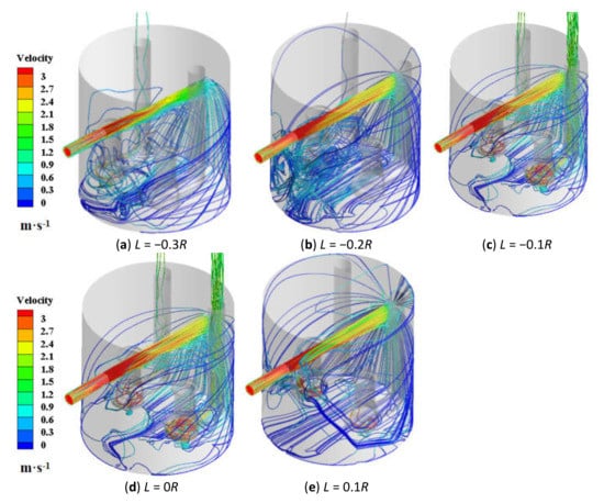 Figure 12 shows the movement trajectories of particles with different center distances. It can be seen that when the installation position of the pump deviates from the center of the pumps and is too close to one side of the inlet pipe or outlet pipe, the suction capacity of the submersible pump is not good. This is because when the submersible pump is too close to the outlet pipe side, the initial velocity of the particles passing through the submersible pump is too large and the inertia causes the movement of the particles to deviate from the streamline of the pump inlet. When the submersible pump is installed near the inlet pipe, the particles are almost stagnant when they move around the pump. The pump’s suction power is not enough to draw them into the flow channel, which also causes more particles to be deposited.