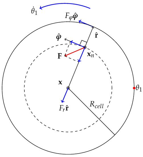 - Paul et al. [48] demonstrated that application of force, originating from nuclear region, on FAs by star-like SF arrangement, results in cells acquiring morphologies typical for motile cells. Since the forces applied on FAs by SFs determine which one ruptures, then it also influences the motion of a cell (due to retraction). Since I am primarily interested in cell migration, it is justified to assume that this architecture represents a realistic situation. Furthermore, Oakes et al. [49] found that modelling SFs embedded in contractile networks, where only SFs actively contract, yields a behaviour mimicking their experimental results—the cytoskeletal flow was directed along the stress fibres. In the same study, the authors concluded that it is appropriate to treat an SF as a 1D viscoelastic contractile element, which also justifies neglecting inertia in Equation (2).