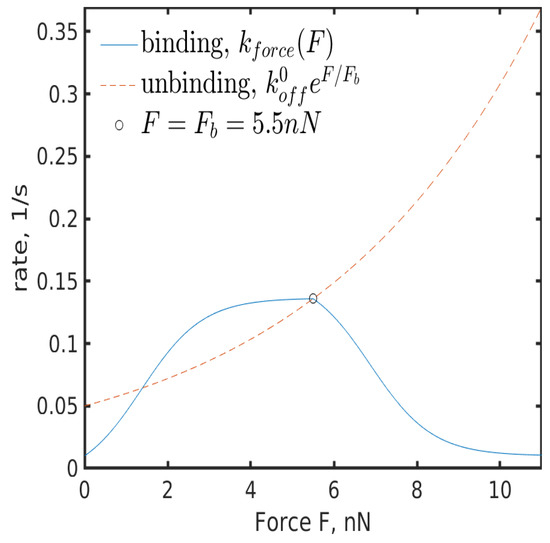 - If the applied force is larger than , then the unbinding rate dominates the binding rate. Note that as FA increases in size, the force dependence diminishes [59]. Thus, should plateau around . I also assume that for large applied forces plateaus at , since exceeding loads rupture integrin bonds frequently and impede stable maturation.