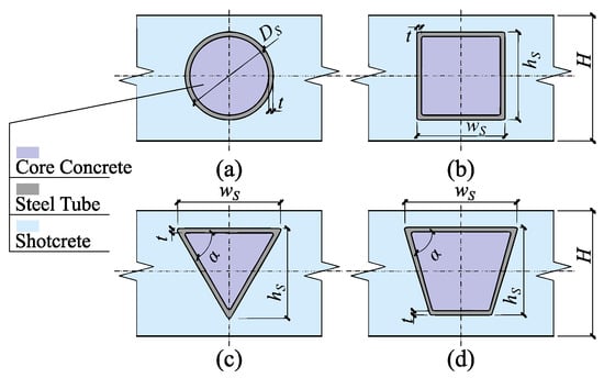 Schematic of closed-type CFST support with various cross-sectional forms. (a) Circular-shaped; (b) rectangular-shaped; (c) triangular-shaped; and (d) trapezoidal-shaped.