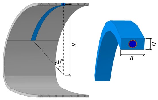 Generally speaking, the tunnel support is a cylindrical structure mainly subjected to bending and compression, and the stress state in its ideal state is close to the plane strain condition. In order to simplify the calculation, under the premise of keeping the main mechanical characteristics of the support as much as possible, the abstraction is made with the support of its upper half cross-section. The circular arch member with a central angle of 120° is regarded as the research object, as shown in Figure 3. R is the radius of the member axis, and B is the cross-sectional width of the member.