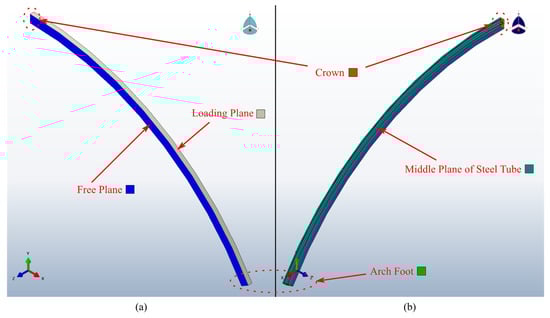 - The outer surface of the arch (refer to the grey-colored zone in Figure 4) corresponds to the contact surface between the surrounding rock and the support, so it is the surface that the loads acting on. According to the Chinese standard [], when there are no asymmetry factors such as bias pressure, the distribution of the load near the crown area is very close to the hydrostatic pressure state. Therefore, a uniformly distributed load was adopted for the normal direction of this surface, in order to simulate the load of the tunnel support in the most general case. The value of the load was automatically calculated by the arc length method, which will be mentioned later.