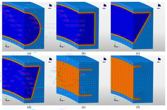 Schematic diagram of the finite element mesh. (a) Circular-shaped CFST member; (b) rectangular-shaped CFST member; (c) triangular-shaped CFST member; (d) trapezoidal-shaped CFST member; (e) H175 profile steel member; and (f) I22a profile steel member.
