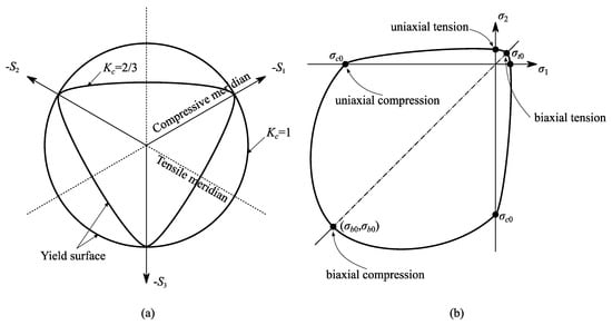 where  and  are parameters referred to as the effective uniaxial cohesion stresses, which have close relationships with the hardening variables of the model;  is the effective hydrostatic pressure, ;  is the Mises equivalent effective stress, ;  is the component of deviatoric effective stress tensor, , where  is the Kronecker delta;  is the algebraically maximum eigenvalue of effective stress tensor;  and  are the equibiaxial and uniaxial compressive yield stress of the material, respectively; , where  is the Mises equivalent effective stress corresponding to an arbitrary point on the projection trace of yield surface on the tensile meridian for any  and  corresponds to such a point on the compressive meridian. The relationship between  and the projection of the yield surface on the deviatoric plane are shown in Figure 6a. The yield surface in the plane stress condition is shown in Figure 6b.