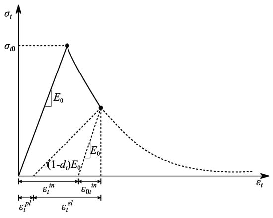 The damage variables, dt and dc, can be calculated according to the following steps. As shown in the Figure 7, for the uniaxial tension, after the material produces inelastic strain , due to the material elastic modulus that has been weakened, the unloading slope  will be less than the initial elastic slope , this means that in the inelastic strain, only the part that will not restore during the unloading is the real plastic strain . Assuming that the proportion of the recoverable part in the inelastic strain is , the damage variable dt can be calculated as