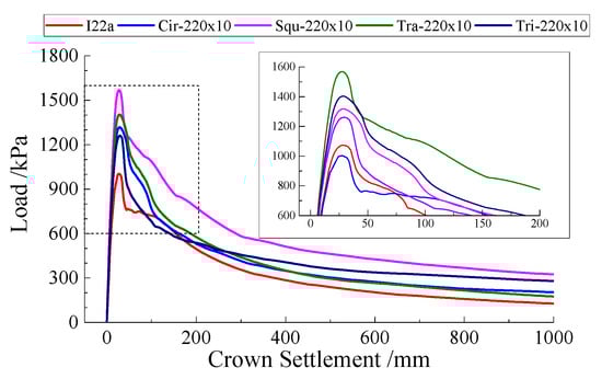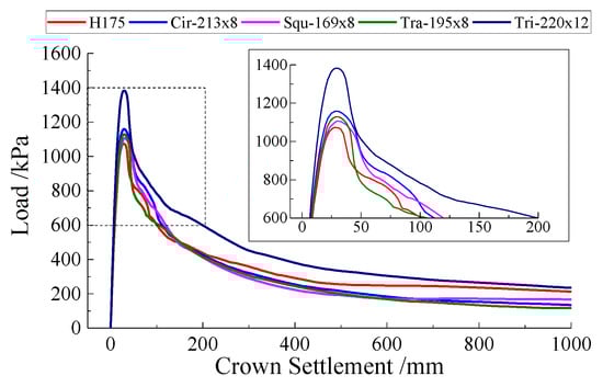 Figure 9 shows the load–crown settlement curve of the research group 1 with the benchmark of steel consumption. It can be seen that the shape of the load–crown settlement curve was similar in all cases. When the load reached about 900 kPa, the stiffness of each case began to differentiate. Among them, the stiffness of the case of Tri-H220×12 was obviously greater than that of other cases, which may caused by the larger cross-sectional height and wall thickness of the steel tube. Each case reached its ultimate capacity when the crown settlement reached about 28 mm. The ultimate capacity of the case of Tri-H220×12 was significantly higher, which was 1383.18 kPa. The rest of the cases had similar ultimate capacities of about 1100 kPa.