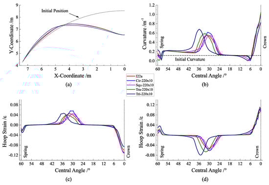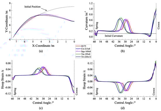 Figure 10a–d is the deformation curve, the curvature distribution curve, and the hoop strain distribution curve at the outer and inner surface of the member in order. These curves are based on the values at the end of the analysis (when crown settlement reaches 2 m) of research group 1. It can be seen from the figure that after the circular arch member buckled under the normal uniform load, the bending mainly occurred in two regions: the crown of the arch was undergoing inward bending, and the spandrel of the arch underwent outward bending. The curvature at the crown was slightly larger than that at the spandrel. Compared with the initial value, the curvature from the spandrel to the arch spring was slightly increased, but the degree of bending was not large. The original curvature was basically maintained in a part of the area above the spandrel. Due to the bending of the spandrel, the member axis in the area above the spandrel was severely offset from the initial position.