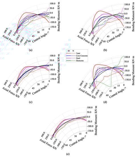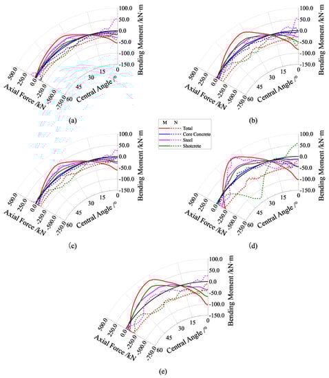 Figure 11 is the internal force distribution diagram of each case at the end of the analysis. Corresponding to their bending modes, the total bending moment distribution of each member was roughly the same. The maximum positive bending moment (caused by outward bending) appeared in the range of the central angle of 30–40°, and the maximum negative bending moment occurred in the crown; the total axial force of each case was almost the compressive force and the distribution was relatively uniform.