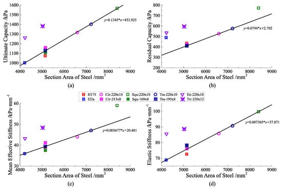 Figure 15c,d clearly shows the similar linear relationship in terms of the mean effective stiffness and elastic stiffness. The stiffness of the triangular-shaped CFST members was significantly higher than other members with the same steel cross-sectional area. In terms of mean effective stiffness, in addition to the case of Tri-H220×12 and Tri-H220×10, the case of Squ-220×10 also exhibited a performance far higher than the average linear relationship, which is due to its extreme strong bending resistance. It can be assumed that the performance of the rectangular-shaped CFST member was greatly affected by the height of the steel tube. The stiffness and bearing capacity of the rectangular-shaped CFST can be very good when the height of steel tube is high enough. Thus, the rectangular-shaped CFST is suitable for the extreme case where the bearing capacity and stiffness are preferentially pursued.