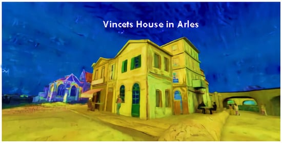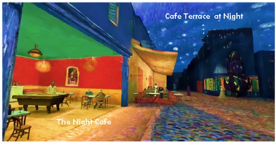The main somatosensory interaction design used in Van Gogh in Dream is painting introduction and character interaction. The first scene is The First Step and Langlois Bridge in Arles. When the audience walks in The First Step, a picture of people’s inquiries appears, mainly to let the audience understand the background of the painting and Van Gogh’s personal story. Then, the audience is guided by two people and the train to a turning point, where there are people from the White House at Night passing by, who the audience can also communicate with. They continue to pass Arles’ Bedroom, at this time a person comes out of the house, and after a conversation, he leads the audience forward, and leaves after Aver’s Church. At this point, the audience can find people to communicate with and finally communicate with the characters in The Starry Sky on the Rhone River. In the same way, the audience is led to the Night Cafe: Outdoor and the Night Cafe: Indoor, as shown in Figure 3. The experiencers explore the night cafe and communicate with them, and finally fully understand Van Gogh’s life.