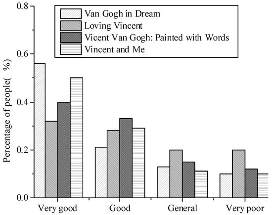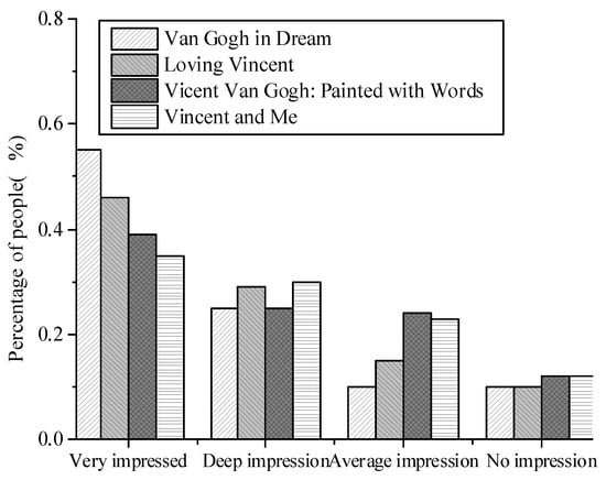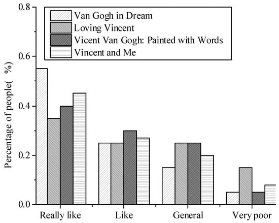Shown in Figure 7 is the result of an impression evaluation of interactive films and traditional films which indicates: 56% of the audience had a very good impression on Van Gogh in Dream, followed by Loving Vincent accounting for 45%; and the most impressive were Loving Vincent and Vincent Van Gogh: Painted with Words accounting for 30% and 32%, respectively; it is believed that Vincent Van Gogh: Painted with Words left the general impression, which accounted for 25%. Vincent Van Gogh: Painted with Words and Van Gogh in Dream account for 10%, leaving no impression, maybe because the narrative of the two films is relatively strong, and the impression is not so deep compared to other methods. The above results show that films based on artificial intelligence technology and films using pure oil painting technology can leave a deep impression on the audience.