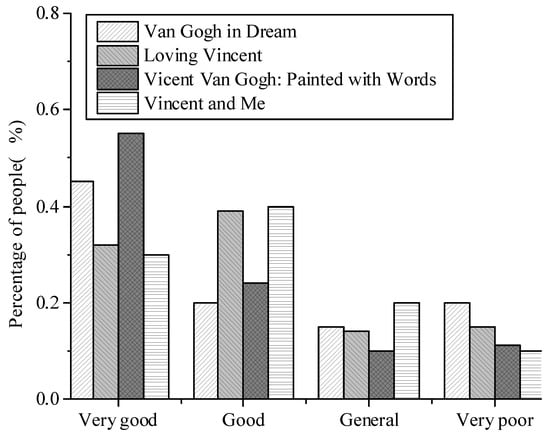 As shown in Figure 8, the results obtained for interactive film and traditional film knowledge show: 57% of the audience feel that the film Vincent Van Gogh: Painted with Words is the most informative, followed by Van Gogh in Dream, accounting for 45%; Vincent Van Gogh: Painted with Words and Van Gogh in Dream have a better knowledge acquisition which accounts for 40% and 41%, respectively. The general knowledge acquisition is in Van Gogh in Dream accounting for 20% and no knowledge acquisition was in Van Gogh in Dream, accounting for 20%. Because of the hasty preparation of this film, more attention is paid to the background knowledge of Van Gogh’s paintings, so less other knowledge is shown. The above results show that traditional film and television production can bring more knowledge to the audience than artificial intelligence films.