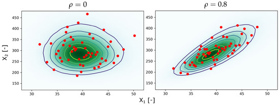 Realizations (red dots) generated by Latin Hypercube Sampling (LHS) and iso-lines of joint probability density of input random vector in uncorrelated (left) and correlated (right) space.