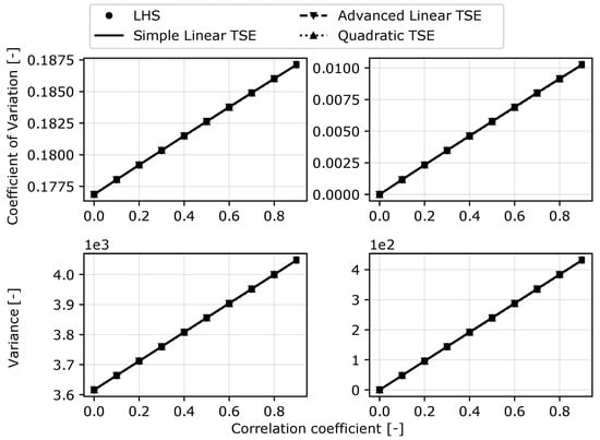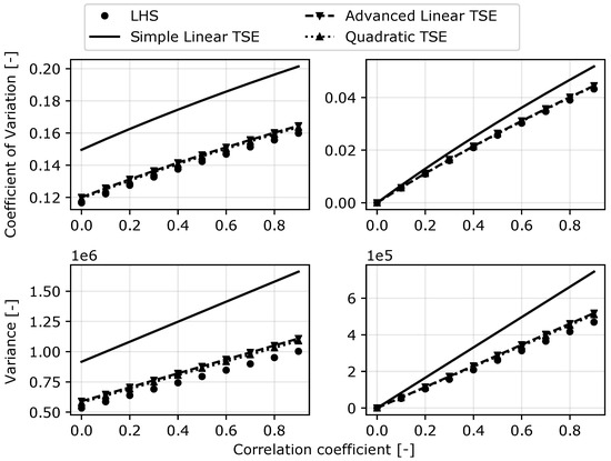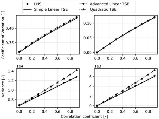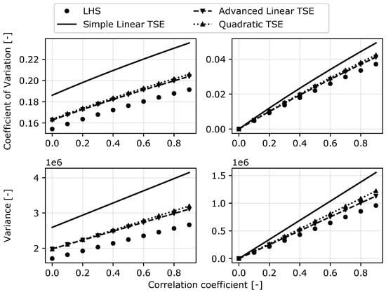 The exact mean value estimated by LHS was and by Taylor series , which leads to the difference between the estimation of CoV and variance depicted in Figure 5. However, the estimation of variance and CoV by linear TSE with advanced differencing together with quadratic TSE was accurate. On the other hand, linear Taylor expansion with simple one-sided backward differencing showed a significant error in estimation for all correlation coefficients. The results on the right-hand side of Figure 5 represent the pure influence of correlation, and as can be seen, the slope of the curve estimated by simple linear TSE was significantly different. Thus, this method is not able to correctly identify the role of correlation.
