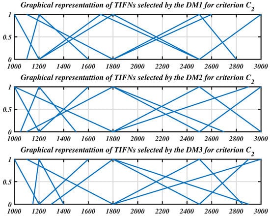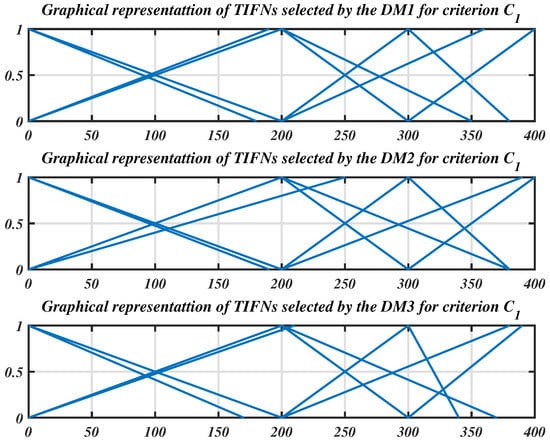 The graphical representations of TIFNs chosen by the DMs for both the criteria and are shown in Figure 2 and Figure 3, respectively.