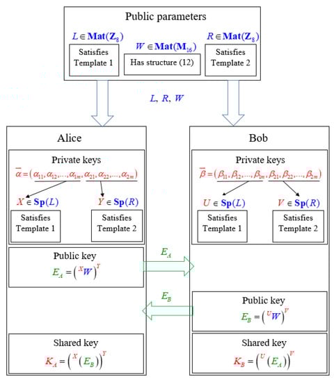 Nevertheless, we can use some facts from our previous research to establish a working key exchange protocol between Alice and Bob. To achieve this goal, we have previously considered the basic properties of the MPF defined over in [25]. Relying on the obtained conclusions and a specified form of the base matrix W we defined several possible templates for power matrices mainly focusing on the left side of (8). In this paper we focus on LRMPF and consider the matrix W to define a slightly different form of this matrix. We think that the new structure described in this paper makes an important contribution to the complexity of the so-called LRMPF problem. Furthermore we define an extra template for the right side power matrices, which cannot be ignored when executing the proposed protocol.