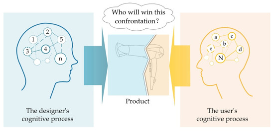 Friction, as a definition in physics, emphasizes that there is a mutual obstruction between relative motion or two objects that have a tendency toward relative motion. CF is due to the resistance caused by the “grey box” or “black box” of the product to users. CF exists in many aspects. As shown in Figure 2, this resistance arises from the cognitive asymmetry between the user and designer in product design, which causes the user’s cognitive discontinuity in the process of using or evaluating the product [36]. Donald Norman proposed three models of CF [37], namely the design model, user model, and system representation. He also believed that CF would be derived from these three models and the differences between them. Among them, the design model mainly expresses the designer’s design concept and represents the designer’s cognitive space. The user model is the concept that the product should exist in the user’s psychology, including the user’s experience and expectations of the product itself, and represents the user’s cognitive space. The system representation is the intuitive perception that the product brings to the user and represents the product system itself.