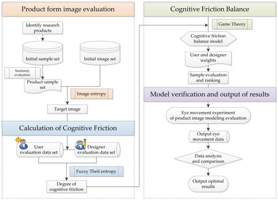 By combining qualitative and quantitative research methods, we establish the flow of the entire study, as shown in Figure 4, including the product form image evaluation, the establishment and application of CF evaluation model and balance model, and the model verification. First, the collection of picture samples was carried out in various ways and combined with morphological similarity evaluation, to obtain the research sample set. Second, the image vocabulary corresponding to this product was collected on the Internet, and the target image vocabulary was obtained through the SD and image entropy method. Next, based on the target image, fuzzy Theil entropy was used to calculate the CF between users and designers, and the samples were sorted and analyzed based on the size of the index. Then, the CF balance model was established based on the game theory equilibrium thought, to obtain the comprehensive evaluation value of the product form under the target image. Finally, the eye-tracking experiment was used to verify the feasibility of the model.