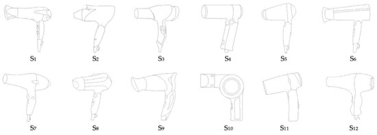 Combined with the hair dryer, a total of 128 sample pictures were collected from product sales websites, periodicals, etc. The authoritative designer conducted a preliminary screening from the form, brand, and other aspects, and obtained a total of 36 initial sample sets. To avoid the influence of external factors such as color and brand, line manuscript processing and numbering were used. Then, the SD method was used to create a product form similarity evaluation questionnaire. Twenty-eight students majoring in design conducted form similarity evaluation, and the K-means clustering method was used to cluster the evaluation results. Thirty-six sample images were clustered into 12 categories, and the clustering results are shown in Table 1. The sample closest to the clustering center of each cluster from each category was selected as a representative to form a research sample set, as shown in Figure 6.