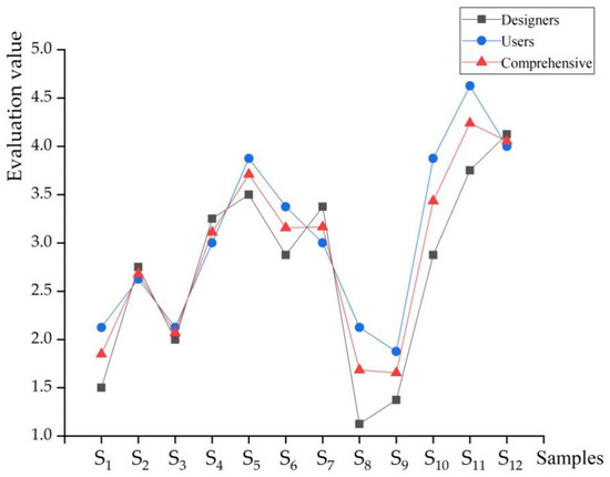For all samples, the comprehensive evaluation value of sample S11 is the highest, which is 4.24; S9 is the lowest, which is 1.66. The ranking of all comprehensive evaluations is as follows: S11 > S12 > S5 > S10 > S7 > S6 > S4 > S2 > S3 > S1 > S8 > S9. For sample S11, its user evaluation value has an absolute advantage in all samples, while the user evaluation value of S9 is the lowest, which shows that the user evaluation participation is essential in the early stage of product development.