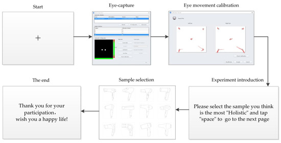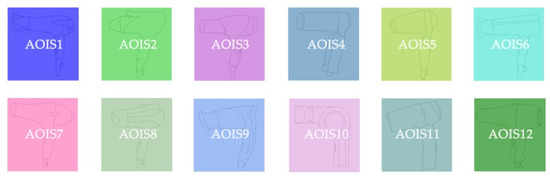 During the design of the experiment, samples S1~S12 were uniformly sized and put into the experimental material with a white background. Each sample was preset as an area of interest (AOI), and then a total of 12 AOIs were formed in the experimental material: AOIS1, AOIS2, AOIS3, AOIS4, AOIS5, AOIS6, AOIS7, AOIS8, AOIS9, AOIS10, AOIS11, and AOIS12, as shown in Figure 10. Five graduate students (with both design-thinking and product-use experience) were randomly selected from the design profession as participants to participate in the experiment, including 3 males and 2 females, all without colour blindness and colour weakness and with corrected vision of 1.0 and above. To ensure the reliability of the experimental results, before the start of the experiment, only the experimental operation process was trained, and the participant of the experiment was not informed. The experiment guideline was set as follows: “please select the sample you think is the most “Holistic” and tap “space” to go to the next page”. The experimental process is shown in Figure 11.