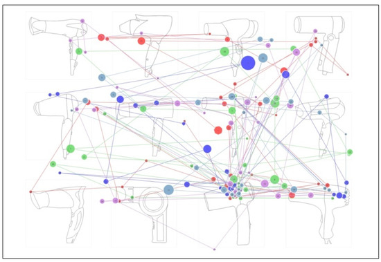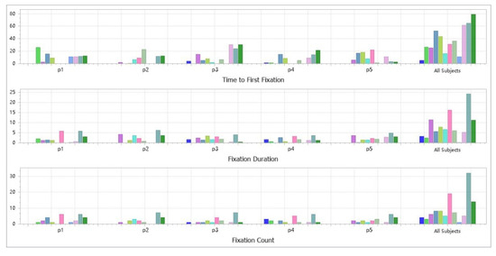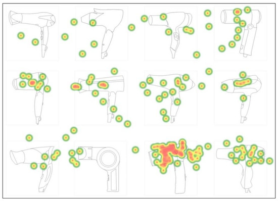 Five participants completed the experiment in turn and received a small gift as a reward. The “Time to First Fixation”, “Fixation Duration”, and “Fixation Count” were taken in AOI as statistical objects. According to the recorded data of ErgoLAB, for all AOIs, the final statistical results are shown in Figure 12. It can be seen from the comprehensive data in the figure that, for the “Time to First Fixation” of AOI, sample S12 is the highest. However, comparing the “Fixation Duration” and “Fixation Count” of each participant and the total, we see sample S11 is much more concerning than sample S12. This shows that, when looking at the sample for the first time, sample S12 will be attractive, but after repeated comparisons, most of the participants will finally choose sample S11 as the sample that is most “Holistic”. This conclusion can also be drawn from the eye movement trajectory of Figure 13 and the heat map of Figure 14, which is consistent with the comprehensive evaluation results in Section 4.3. Therefore, the balance model of CF is effective and feasible in the actual evaluation process. In the subsequent design of the form of the hair dryer, sample S11 can be used as a design reference for the “Holistic” target image.