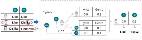 To better describe how the LFM works, an insight of the model is shown in Figure 1. As shown, when a record implies that the consumer likes one piece of music but dislikes another one, we can analyze this information by mapping it to the latent factor vector, such as the (lyrics, genre) vector. We subsequently obtain the consumer vector (0.9, 0.1) and item vectors (0.8, 0.8) and (0.1, 0.1), from which we can understand the preference score of the consumer and items for each latent factor. The dot product of the consumer vector and item vector presents the comprehensive preference of the consumer for the items. If we adopt the binary inference as in Refs. [11,23], and the preference ≥0.5, then the consumer is in favor of this item; otherwise, the consumer dislikes it. Finally, the model objective is to predict the unknown preference using observations.