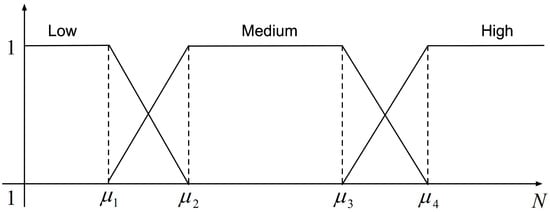 Denote the implicit feedback information as ( user with items) and means the usage frequency of user on item i. The linguistically represented label is arranged as l = l1 = low-preference, l2 = medium-preference, l3 = high-preference to describe the various preference levels for each consumer on the item. The fuzzy semantics is illustrated in Figure 3, where are determined in the exact application scenario. The next step is to construct the membership function that maps implicit feedback data to each linguistically represented label in . Therefore, we build the membership function to characterize the relationship between usage frequency and preference rating in each level by expanding the scale of 1–5 [12] to 1-N.