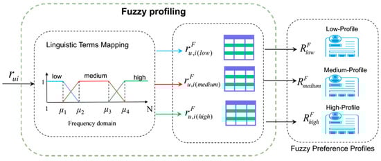 Specifically, the fuzzy preference profiles (including , , and ) are computed via the membership function , built as in Equations (3)–(5)
