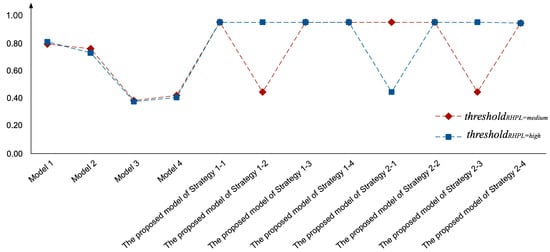 To further explore the influence of strategy weight, a sensitivity analysis is performed based on Strategy 1-2 and Strategy 2-2 since they both show distinct performance with various thresholds as Figure 10. First, the weight of is controlled for the convenience of comparison. Then we adjust , with step size of 0.05, in the range of 0.05–0.3 for Strategy 1 and in the range of 0.5–0.75 for Strategy 2, respectively. Accordingly, the weight of can be obtained. Finally, based on the proposed model, the F-measure at medium-preference level and high-preference level are derived, displayed in Table 6.