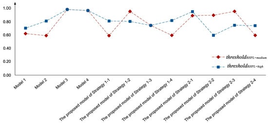 In conclusion, through sensitivity analysis of strategy weightings, we can see that the value of in fact influences the recommendation results, especially at thresholdRHPL=medium. In addition, a specific guidance for setting strategies with is derived that we can set for Strategy 1 and for Strategy 2 to obtain optimal recommendation.