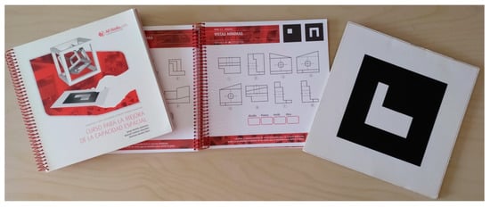 The training itself delivered a total of nine hours of self-study content spread over the course of five days (Monday–Friday). The training was divided into four 2-h sessions and a single 1-h session. A single two-hour training session was delivered each day (Monday–Thursday), except for the last day (Friday). On the final day, the single 1-h session was used solely for evaluation purposes. One training session (one day) is the equivalent to one level. Training required the use of an “augmented book” containing different sets of tasks designed to exercise and develop spatial awareness skills [79]. The underlying concept of the book consists of combining AR features with those of a physical textbook. In other words, digital content is associated with content taught using printed text in a paper book. In doing so, it is possible to greatly broaden the amount of didactics resources available. In order to do this, the research team developed a piece of software to access and display the content contained within the Augmented Book. This software is based on a personal toolkit used for AR marker tracking that allows 3D objects to be visualized in augmented reality [76]. To run the training, the computer software associated with the augmented book was installed on the computers in the computer laboratories at each university.