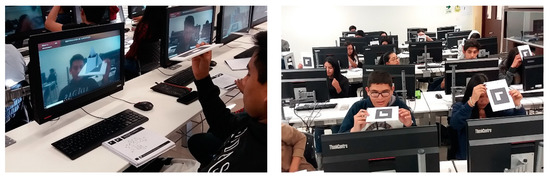Each page of the Augmented Book contains one exercise. In the upper-right-hand corner of the printed page there are a pair of fiducial markers (see Figure 2). When a printed page is captured onscreen via the computer’s webcam, the AR app detects these fiducial markers and identifies which corresponding exercise should be displayed. The user can then interact with virtual content and manipulate figures with their hands using the general markers, either from the printed book or on their smartphones (see Figure 3).