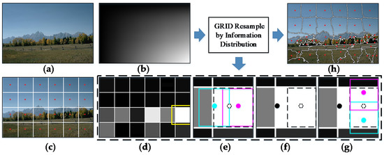 The schematic diagram of the proposed GRID initialization method. (a) Input image; (b) Summed area table corresponding to the lightness channel of (a); (c) Grid sampling initialization with half the expected number of seeds; (d) The ordered distribution of color information for all rectangular cells of (c), and the sub-region surrounded by a yellow rectangle containing the maximum information. For visualization, the values are normalized in the range of 0 to 255 as well as (b); (e–g) Zoom-in GRID performance of (d), which are performed recursively till the expected superpixel number is obtained. (h) The result of superpixel segmentation. The black dotted rectangle and circle denote the region with maximum information and corresponding initial seed, respectively. The color solid rectangles and filled circles denote the sub-regions and the sub-divided seeds that balance the information to a certain extent. A black filled circle represents that the amount of information in the corresponding sub-region is not the most in the current loop. It is likely to be sub-divided after several rounds of global sorting of the regional information amount.