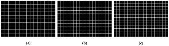 Sample grids against different excepted numbers of superpixels over a 481 × 321 image in black. (a) The actual cell number is 150, identical to the expectation. (b) The actual cell number is 187, less than the expectation of 200. (c) The actual cell number is 260, more than the expectation of 250. Note that cells at the right and lower sides are not squares because of the deviation by floor operations.