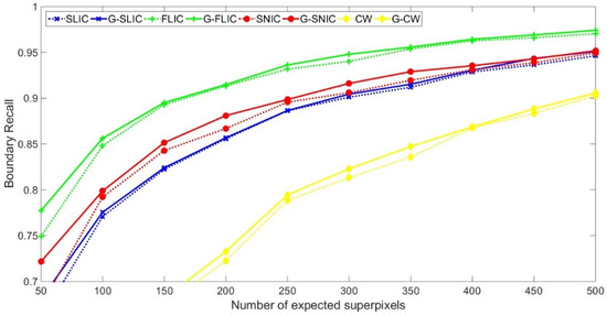 The performance of the proposed GRID is evaluated on the Berkeley Segmentation Data Set 500 (BSDS500) [31], which comprises three image sets, training (100), validation (200) and testing (200). The images for segmentation are all or in size, along with manual ground truth. Superpixels produced by SLIC [13], FLIC [17], SNIC [18] and CW [21] are utilized as the reference group. The corresponding GRID-embedded algorithms termed as G-SLIC, G-FLIC, G-SNIC and G-CW are implemented as an experimental group to show their superiority, respectively. The default parameters of the available online code are used for a fair comparison, while only the round operation of the grid interval is modified on the basis of Equation (1). In addition, the gray value is used instead of lightness in CW and G-CW since they are performed on RGB color space rather than CIELAB.