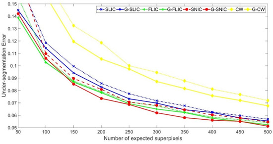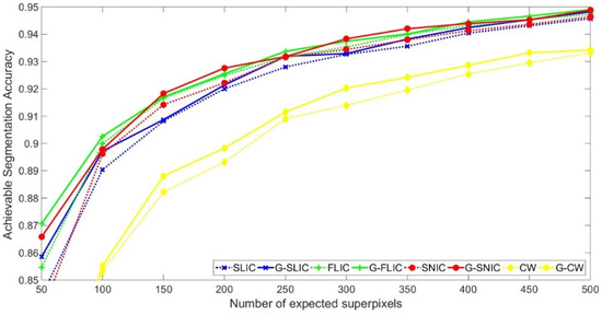 Figure 4 makes comparisons between reference algorithms and the corresponding improvements. It is clear that all the performance of GRID-embedded implementations upgrades, especially when the expected number is small. Nevertheless, there are still significant gaps among four pairs of algorithms. Theoretically in conventional SLIC, a minor distance in Equation (1) is acquired by comparing the value of a current pixel with the previous in a region. Such a forward judgment easily leads to misclassification since some heterogeneous pixels might show relatively short distances at the beginning of local k-means clustering. Even the situation can be alleviated by repeated iterations, it results in inferior segmentation performance. In contrast, FLIC adopts an active search strategy to avoid the clusters being limited in a fixed range in space; the influence can be abated by absorbing more homogeneous pixels. It therefore achieves more acceptable boundary adherence than SLIC in a wider range of predicted superpixel numbers. Different from SLIC and FLIC, SNIC generates superpixel regions in a one-pass manner instead of iterative re-labeling in global scope, which also achieves a better performance. In CW, the compactness sometimes cumbers the adaption to object boundaries while it prevents the production of very large fragments. It does not work very attractively unless the amount of superpixels is high enough.