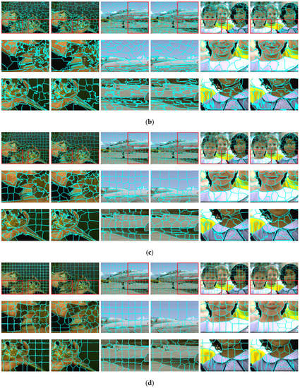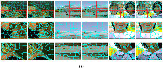 Nevertheless, SLIC and its variants pursue an expected region with estimated size for each superpixel, which requires an identity of and in Equation (8). To alleviate the contradiction caused by a different value of and , some boundary cells may adjust their own side length to maintain the main part as multiples of . As shown in Figure 3, this may go against the number of superpixels specified by the user.