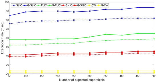 A detailed discussion on the performance of time cost is presented in Table 3, with emphasis on 200 user-specified numbers of superpixels. All the algorithms consist of the two steps, initialization, assignment and updating, wherein SLIC/G-SLIC and FLIC/G-FLIC require an additional merging step as post-processing. Since the initialization of conventional grid sampling in Equation (8) is merely a numerical calculation, its time consumption can be omitted. The extra time consumed on GRID initialization is identical in all methods, and the additional 2 milliseconds are almost spent on establishing the SAT and relocating the new seeds. For G-SNIC and G-CW, the procedure of assignment and updating spends the same time as SNIC and CW, respectively. That is because both the two pairs of algorithms follow a non-iterative label expansion manner to cluster the superpixel regions in Figure 2. Therefore, the total computation is almost identical to a different number of expected superpixels. As a result, the disparity of time cost in this step is negligible when the difference of seeds (superpixels) number is very small in Table 2. Whereas in G-SLIC and G-FLIC, more seeds indicate that more search regions need to be inspected. While the conventional SLIC and FLIC are both irrespective of seed number in theory, the additional inspection by GRID in Figure 1e–g costs an extra 9% and 4% time. Meanwhile, the optimized post-processing step mentioned in Section 4.1 also increases the time cost slightly. Overall, compared with the conventional methods, GRID-embedded implementation can be recognized as a balanced trade-off between runtime and accuracy. It also provides plug-and-play capability for several gradient-based superpixel methods with very minor modifications on the clustering procedure.