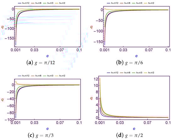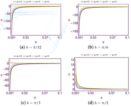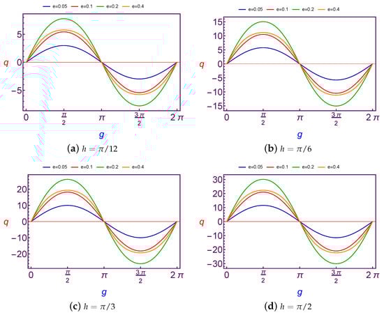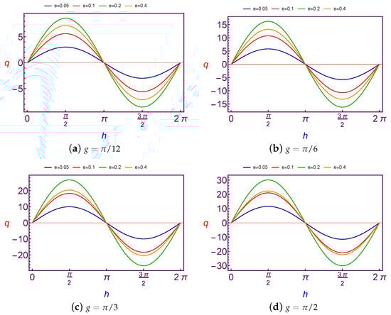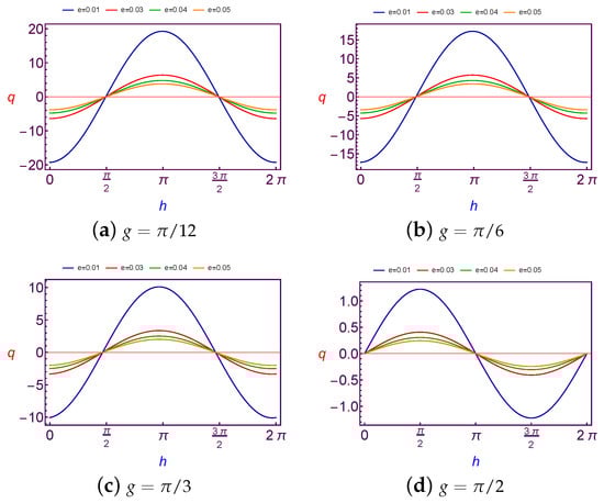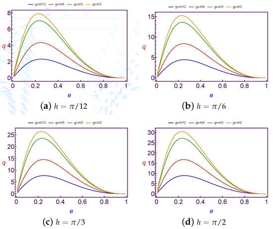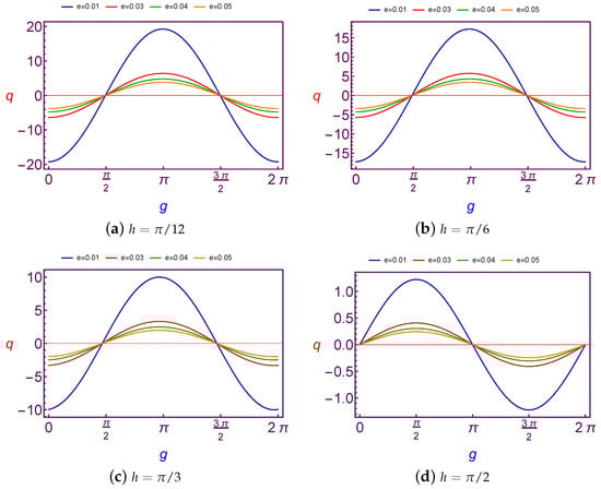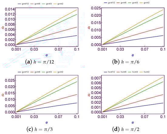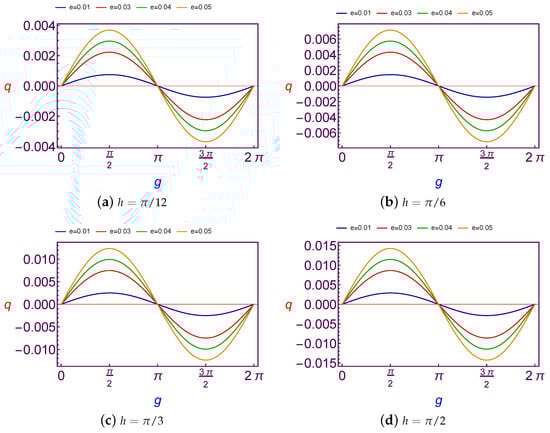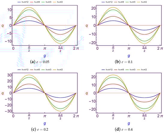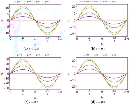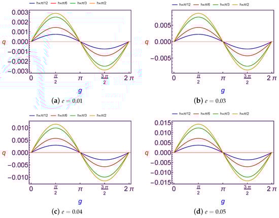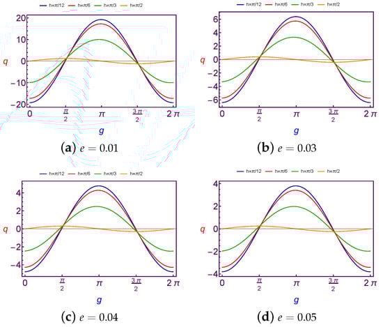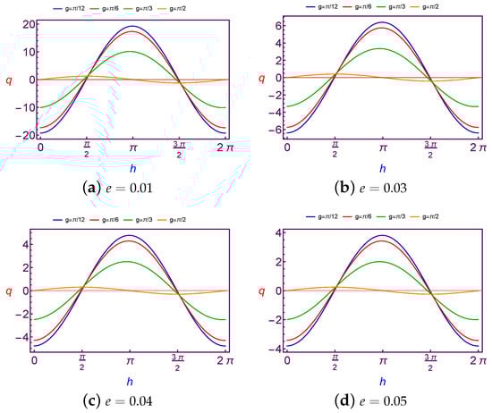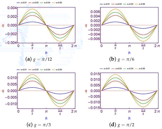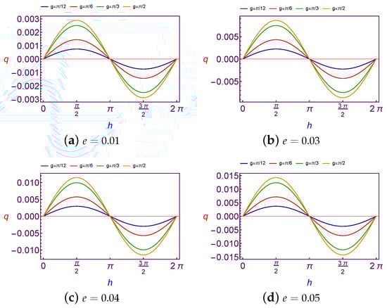 The estimation of the charge per mass unit (q), which is required to balance the longitude of ascending node (h) of the spacecraft’s orbit will be shown numerically through multiple diagrams in Figure 1, Figure 2, Figure 3, Figure 4, Figure 5, Figure 6, Figure 7, Figure 8, Figure 9 and Figure 10. This estimation will be investigated by using Equation (30) in the following three subsections.
