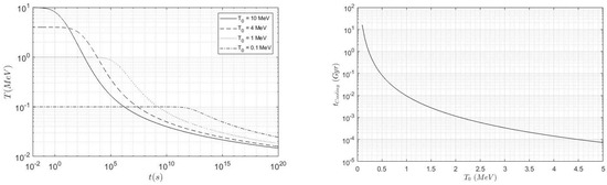 Numerical solutions of Equation (16) are represented in Figure 1 left panel, where different curves correspond to different initial temperatures . As seen, the temperature falls sharply around keV and then smoothly subsides to keV during a period . It is drawn in Figure 1 right.