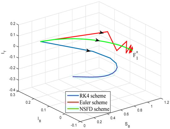 In this case, and is globally asymptotically stable. We use the Euler scheme, the classical fourth-stages Runge–Kutta (RK4) scheme and NSFD schemes (6) to numerically solve system (2). The numerical solutions obtained by these schemes are presented in Figure 1. From this figure, we see that the numerical solutions obtained by the Euler scheme and the RK4 schemes are not positive, their boundedness is destroyed. The Euler scheme gives the numerical solutions oscillating near the equilibrium points. Meanwhile, the numerical solution obtained by NSFD schemes preserve the essential properties of the model (2). Besides, the NSFD schemes is easily realized. It is the advantages of the NSFD schemes compared with standard difference schemes. Other examples give the same results. This fact completely agrees with several results in the previous works [11,13,14,15,20,21,22,23].