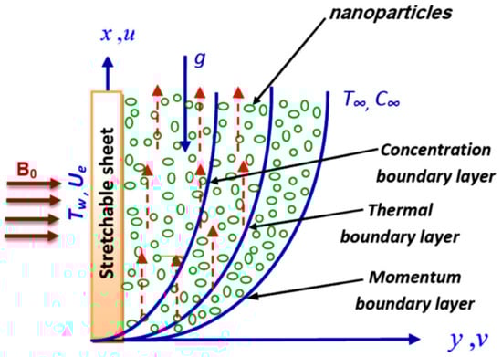 In modern times, the novel investigations of nanofluid flow through stretchable surfaces have got valuable attention among study scientists and community because of its abundant practical utilization, in several areas of science and biotechnology. Nanofluids play a momentous role in the mechanism of heat transfer. The typical base fluids, e.g., water, alcohol, ethylene glycol, and oil have a weak capacity to promote the heat transfer rate. However, this complex scenario was resolved by asserting the tiny sized solid fragments in the base fluids. It was basically proposed by Choi [1] that the tendency of the base fluids to embellish the thermal properties can be more effective by adding nanoparticles in these fluids. Nanofluids are spawned by dispersion of nanoparticles along with base fluids and these fluids are the amalgamations of suspended nano-sized pieces (1–100 nm) in base fluids. The constituents of nanoparticles may contain metals, carbides, nitrides, and oxides. With enhanced and improved thermal mechanism, nanofluids have huge applications containing microwave tubes, microelectronic chips engines, grinder machines, drag reduction, refrigerators, pharmacology, tumor and cancer therapy, gas recovery of boiler exhaust fuel, supersonic and ultrasonic fields, high power lasers, welding cooling, vehicle engine cooling, nuclear system cooling, and thermal storage capacity [2,3]. In a new era of research, the study community has made tremendous efforts to enrich the experimental work, theoretical models, and numerical simulations of magneto-nanofluids. The characteristics of radiation impact on the stretched magneto-flow of non-Newtonian nanofluid were explored by Kumar et al. [4]. The hybrid linearization differential quadrature method was utilized to scrutinize the magneto-nanofluid flow past a radiative surface with streamwise diversity in wall temperature reported by EL-Zahar et al. [5]. Many investigators [6,7,8,9,10,11,12,13,14] to undertake the nanofluids flow past various configurations and geometries.