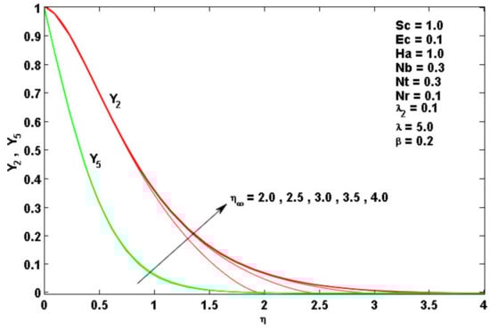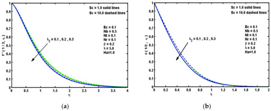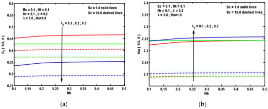 Figure 7a,b are plotted to analyze the impacts of the ratio of relaxation to retardation times λ2 and Schmidt number Sc on velocity and temperature curves. It is apparent that both of velocity and temperature curves decline with the enhancement in λ2 parameter while opposite results are obtained for the intensity of Sc. The consequences of Sc and λ2 on Cf(τ,0) and Nu(τ,0) on along with Nb is visualized in Figure 8a,b. It is observed that Cf(τ,0) reduces and Nu(τ,0) enhances by augmenting λ2. Moreover, both Cf(τ,0) and Nu(τ,0) reduce sufficiently by enlarging Sc. This may occur owing to the cause that Schmidt number is reversely symmetrical to the Brownian diffusion coefficient. This Brownian diffusion coefficient becomes lower corresponding to the greater values of Sc and also Brownian movement happens in the system of the nanofluid due to contact of nanoparticles with the regular fluid.